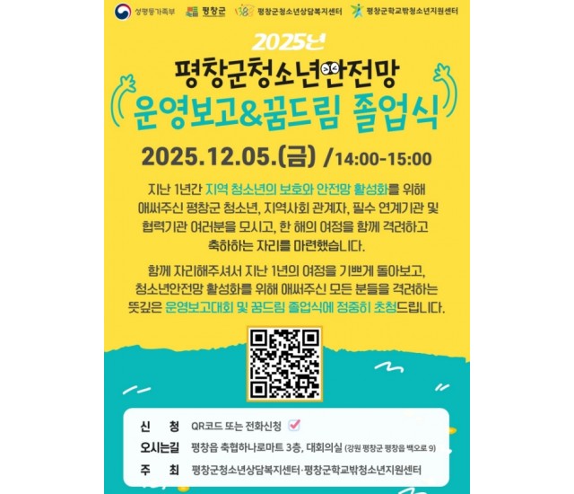 평창군청소년상담복지센터 주관으로 운영 중인 청소년 참여기구 '평창군청소년참여위원회'(제18기)가 12일 활동 결과를 담은 정책 제안서를 심재국 평창군수에게 전달했다. 제안서의 핵심 내용은 '평창군 청소년 정책 참여 확대를 위한 전용 온라인 플랫폼 구축 및 홍보 방안'이다. 보도기사: https://www.yna.co.kr/view/AKR20251212115000062?input=1195m