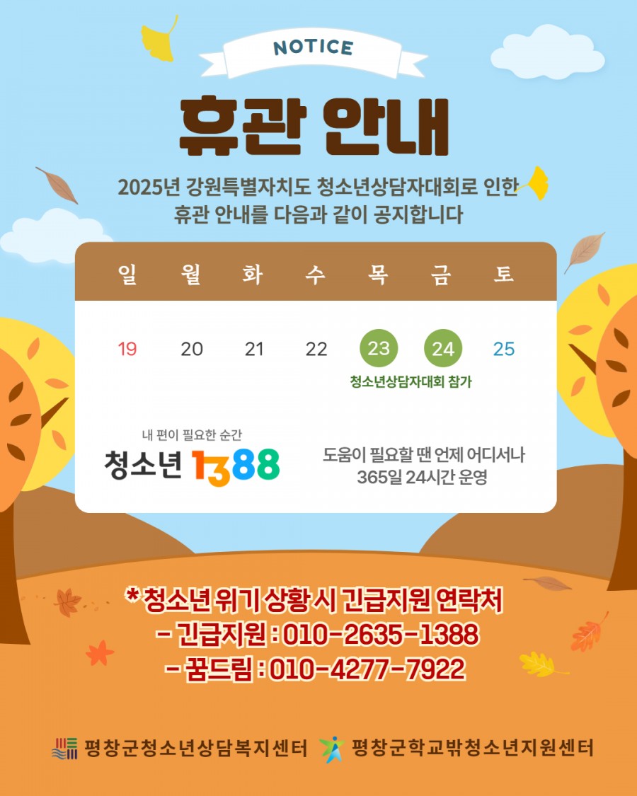 [휴관 안내] 2025년 강원특별자치도 청소년상담자 대회 참여로 인한 휴관 안내
