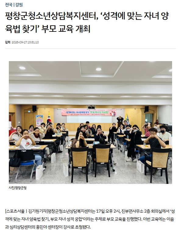 3. 내용 : 평창군청소년상담복지센터는 17일 오후 2시, 진부면사무소 2층 회의실에서 ‘성격에 맞는 자녀 양육법 찾기, 부모 자녀 성격 궁합’이라는 주제로 부모 교육을 진행했다. 이번 교육에는 이음과 심리상담센터의 홍민아 센터장이 강사로 초청됐다. (중략)