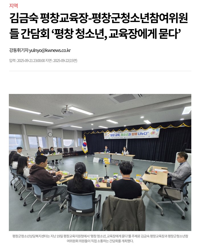 3. 내용 : 평창군청소년상담복지센터는 지난 19일 평창교육지원청에서 ‘평창 청소년, 교육장에게 묻다’를 주제로 김금숙 평창교육장과 평창군청소년참여위원회 위원들이 직접 소통하는 간담회를 개최했다. 이번 행사는 청소년이 교육 현안에 대해 직접 질문하고 교육장이 답하는 형식으로 진행됐다. 특히 △인공지능(AI) 디지털 교육 △지역 특색을 살린 진로 교육 △학생 주도 프로젝트 활동 등이 주요 주제로 다뤄졌다. (중략)