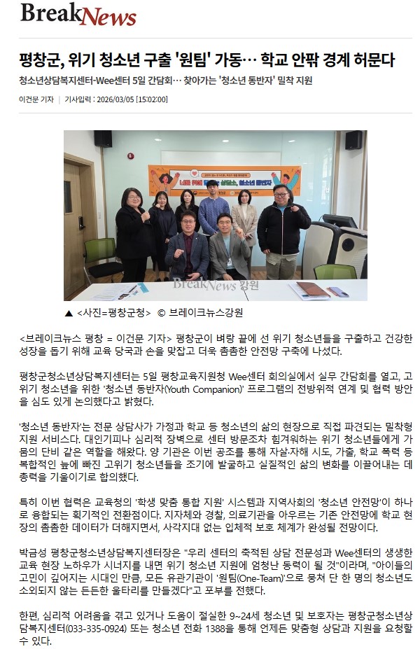 평창군, 위기 청소년 구출 '원팀' 가동… 학교 안팎 경계 허문다 (2026. 3. 5.)