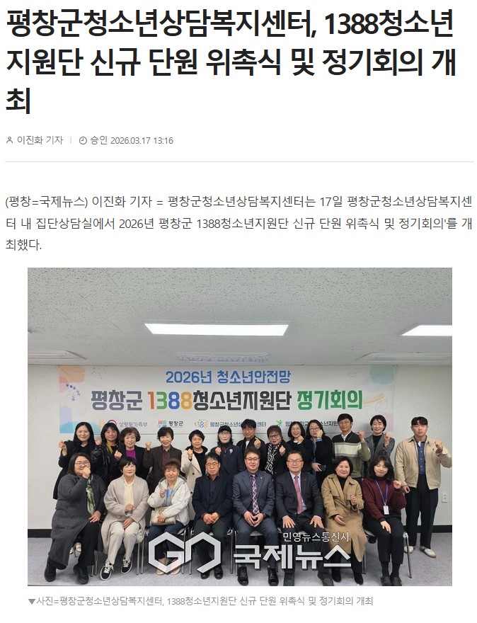 3. 보도내용 : 평창군청소년상담복지센터는 17일 평창군청소년상담복지센터 내 집단상담실에서 2026년 평창군 1388청소년지원단 신규 단원 위촉식 및 정기회의'를 개최했다. (중략) 박금성 평창군청소년상담복지센터장은 "1388청소년지원단과 함께 지역사회가 협력하여 위기청소년을 조기에 발견하고 지원함으로써 청소년들이 건강하게 성장할 수 있는 환경이 조성되길 바란다."라고 말했다.