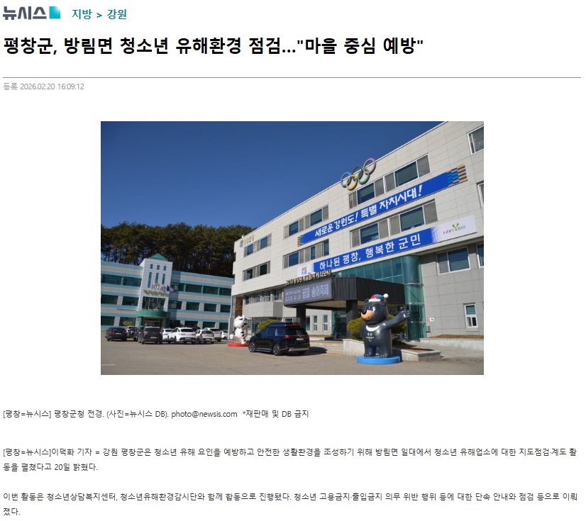 3. 보도내용 : 강원 평창군은 청소년 유해 요인을 예방하고 안전한 생활환경을 조성하기 위해 방림면 일대에서 청소년 유해업소에 대한 지도점검·계도 활동을 펼쳤다고 20일 밝혔다.