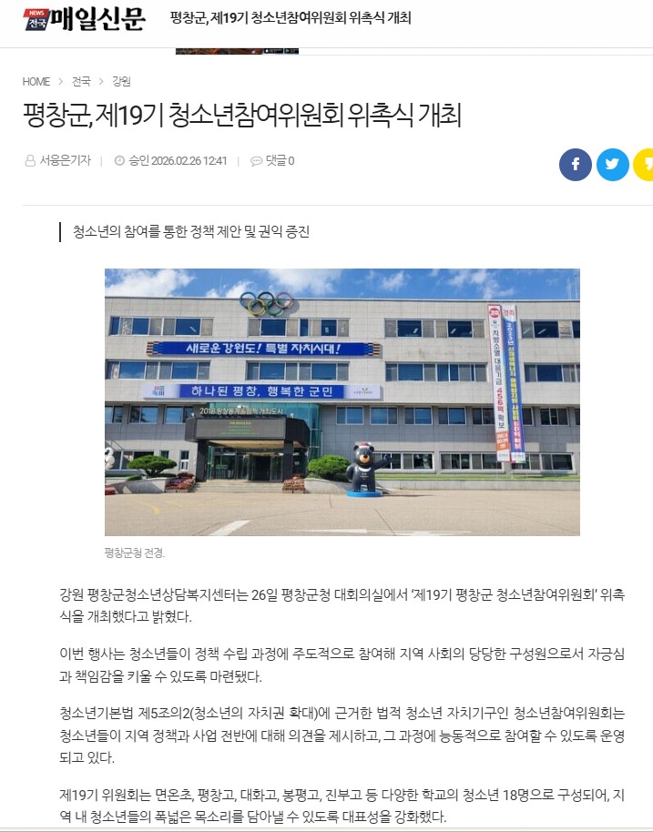 3. 보도내용 : 강원 평창군청소년상담복지센터는 26일 평창군청 대회의실에서 ‘제19기 평창군 청소년참여위원회’ 위촉식을 개최했다고 밝혔다. 이번 행사는 청소년들이 정책 수립 과정에 주도적으로 참여해 지역 사회의 당당한 구성원으로서 자긍심과 책임감을 키울 수 있도록 마련됐다. 청소년기본법 제5조의2(청소년의 자치권 확대)에 근거한 법적 청소년 자치기구인 청소년참여위원회는 청소년들이 지역 정책과 사업 전반에 대해 의견을 제시하고, 그 과정에 능동적으로 참여할 수 있도록 운영되고 있다. (중략)