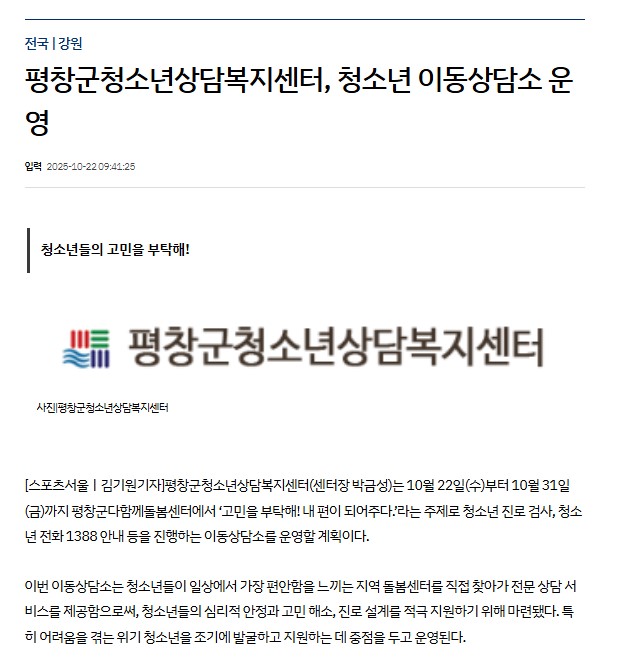 3. 보도내용 : 평창군청소년상담복지센터(센터장 박금성)는 10월 22일(수)부터 10월 31일(금)까지 평창군다함께돌봄센터에서 ‘고민을 부탁해! 내 편이 되어주다.’라는 주제로 청소년 진로 검사, 청소년 전화 1388 안내 등을 진행하는 이동상담소를 운영할 계획이다. (중략)