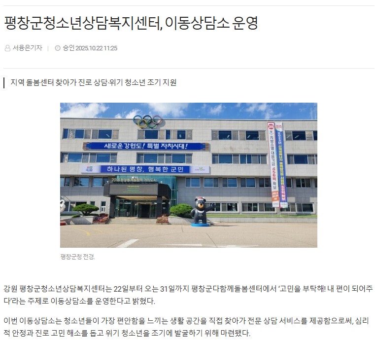 3. 보도내용 : 강원 평창군청소년상담복지센터는 22일부터 오는 31일까지 평창군다함께돌봄센터에서 ‘고민을 부탁해! 내 편이 되어주다’라는 주제로 이동상담소를 운영한다고 밝혔다.