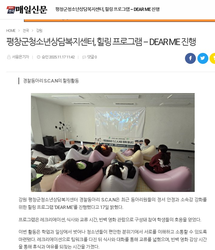 3. 보도내용 : 강원 평창군청소년상담복지센터 경찰동아리 S.C.A.N은 최근 동아리원들의 정서 안정과 소속감 강화를 위한 힐링 프로그램 ‘DEAR ME’를 진행했다고 17일 밝혔다.