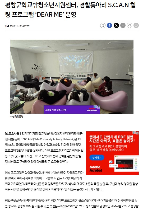 3. 보도내용 : 평창군청소년상담복지센터(센터장 박금성) 경찰동아리 S.C.A.N (Safe Comunity Activity Network)은 11월 15일, 동아리 학생들의 정서적 안정과 소속감 강화를 위해 힐링 프로그램 ‘DEAR ME’를 실시했다. 이번 프로그램은 레크리에이션 활동, 식사 및 교류의 시간, 그리고 빈백에서 함께 영화를 관람하는 힐링 세션으로 구성되어 참여 학생들의 큰 호응을 얻었다.