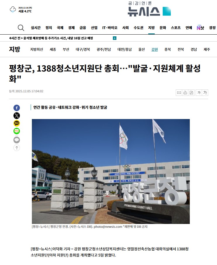3. 내용 : 강원 평창군청소년상담복지센터는 영월정선축산농협 대회의실에서 1388청소년지원단(이하 지원단) 총회를 개최했다고 5일 밝혔다. 이번 총회는 연간 활동 공유와 단원 간 네트워크 강화를 통해 위기 청소년 발굴 및 지원체계 활성화를 목표로 했다. 회의에서 지원단 올해 연간 활동 공유 및 내년 운영 방안, 위기 청소년 발생 여부 점검 및 발생 시 지원 방안, 지원단원 간 교류 활동 등을 논의했다. 1388청소년지원단은 지역사회 내 위기 청소년 지원을 위해 구성된 민간 조직으로 발견·구조, 상담·멘토링, 의료·법률, 복지 등을 포괄하는 하부조직을 운영한다. (중략)