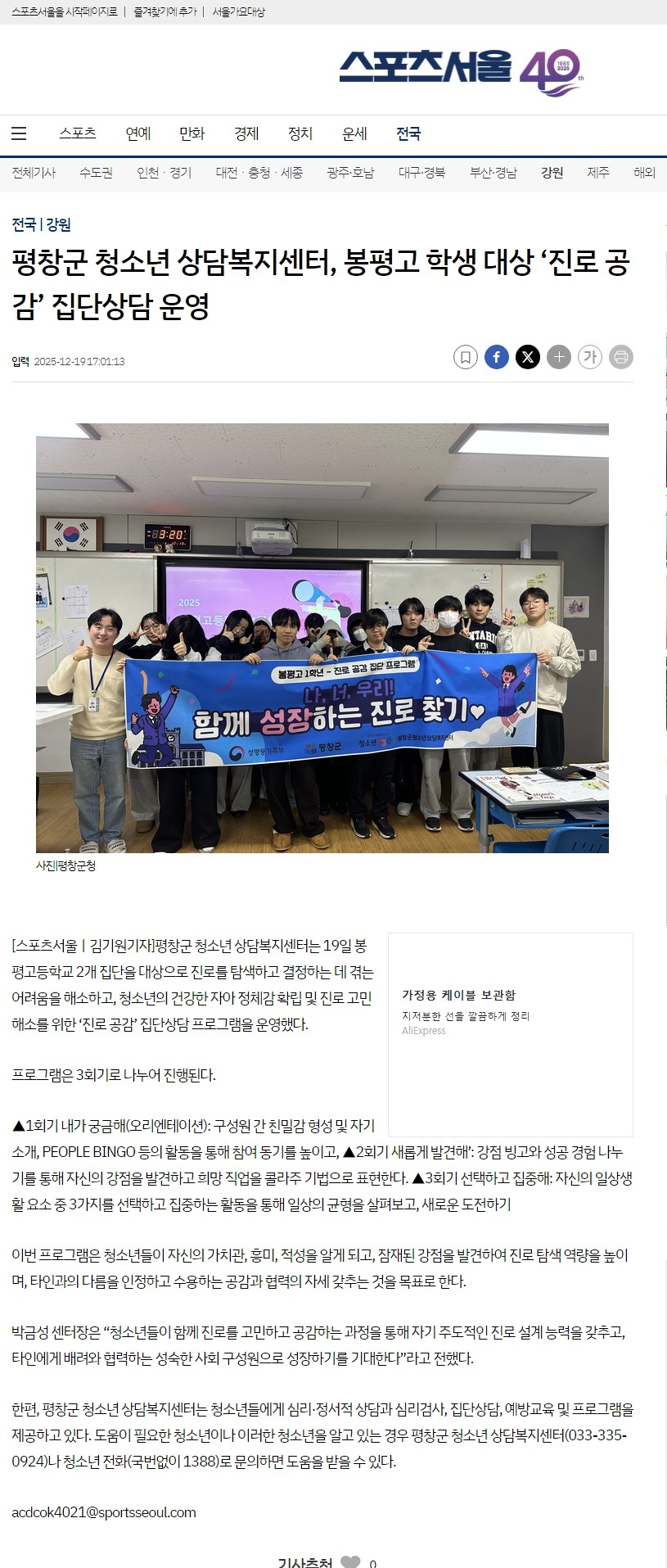 평창군청소년상담복지센터, 봉평고 학생 대상 '진로 공감' 집단상담 운영