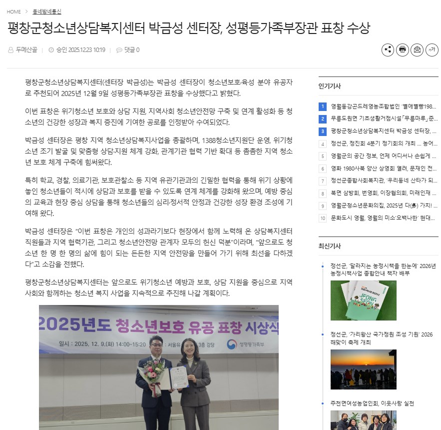 3. 보도내용 : 평창군청소년상담복지센터(센터장 박금성)는 박금성 센터장이 청소년보호·육성 분야 유공자로 추천되어 2025년 12월 9일 성평등가족부장관 표창을 수상했다고 밝혔다.