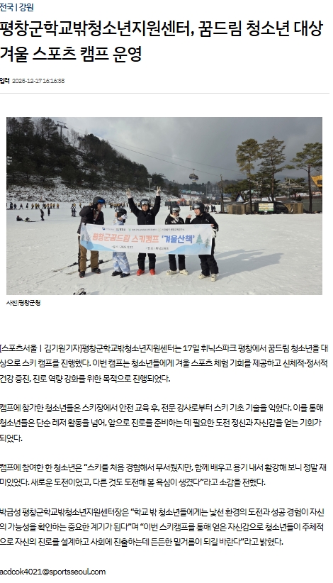 평창군학교밖청소년지원센터, 꿈드림 청소년 대상 겨울 스포츠 캠프 운영