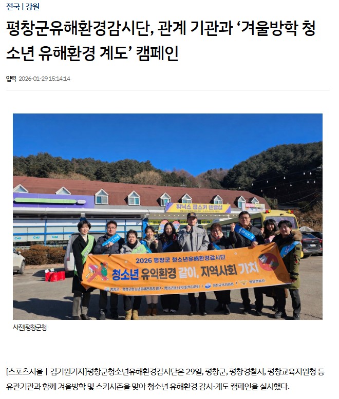 3. 보도내용 : 평창군청소년유해환경감시단은 29일, 평창군, 평창경찰서, 평창교육지원청 등 유관기관과 함께 겨울방학 및 스키시즌을 맞아 청소년 유해환경 감시·계도 캠페인을 실시했다.