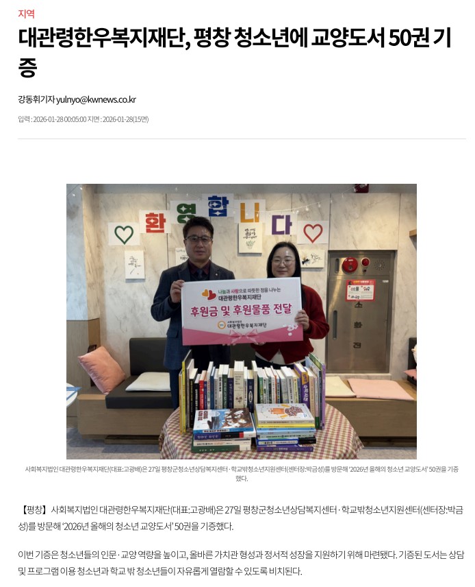 3. 보도내용 : 사회복지법인 대관령한우복지재단(대표:고광배)은 27일 평창군청소년상담복지센터·학교밖청소년지원센터(센터장:박금성)를 방문해 ‘2026년 올해의 청소년 교양도서’ 50권을 기증했다. 이번 기증은 청소년들의 인문·교양 역량을 높이고, 올바른 가치관 형성과 정서적 성장을 지원하기 위해 마련됐다. 기증된 도서는 상담 및 프로그램 이용 청소년과 학교 밖 청소년들이 자유롭게 열람할 수 있도록 비치된다. (중략)
