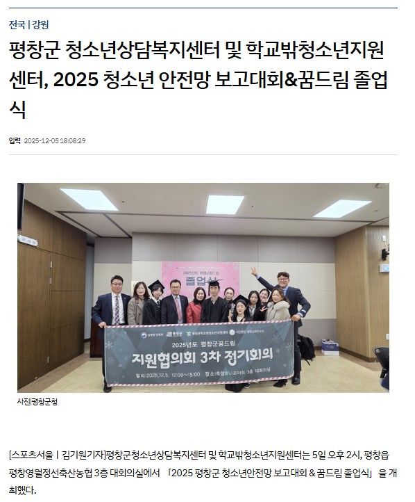 3. 보도내용 : 평창군청소년상담복지센터 및 학교밖청소년지원센터는 5일 오후 2시, 평창읍 평창영월정선축산농협 3층 대회의실에서 「2025 평창군 청소년안전망 보고대회 & 꿈드림 졸업식」을 개최했다.