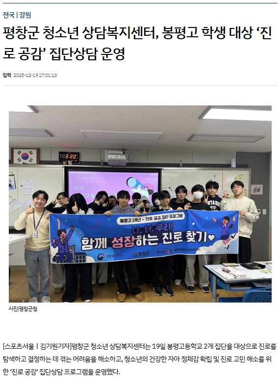 3. 보도내용 : 평창군 청소년 상담복지센터는 19일 봉평고등학교 2개 집단을 대상으로 진로를 탐색하고 결정하는 데 겪는 어려움을 해소하고, 청소년의 건강한 자아 정체감 확립 및 진로 고민 해소를 위한 ‘진로 공감’ 집단상담 프로그램을 운영했다. (중략) 이번 프로그램은 청소년들이 자신의 가치관, 흥미, 적성을 알게 되고, 잠재된 강점을 발견하여 진로 탐색 역량을 높이며, 타인과의 다름을 인정하고 수용하는 공감과 협력의 자세 갖추는 것을 목표로 한다.
