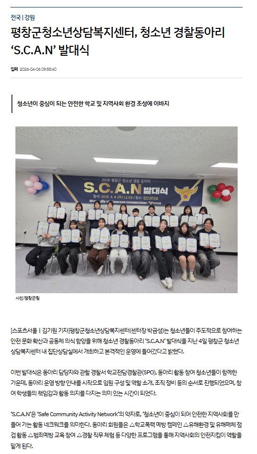 3. 보도내용 : 평창군청소년상담복지센터(센터장 박금성)는 청소년들이 주도적으로 참여하는 안전 문화 확산과 공동체 의식 함양을 위해 청소년 경찰동아리 ‘S.C.A.N’ 발대식을 지난 4일 평창군 청소년상담복지센터 내 집단상담실에서 개최하고 본격적인 운영에 들어갔다고 밝혔다. (중략) 박금성 센터장은 “청소년이 스스로 참여하고 실천하는 활동을 통해 건강한 사회 구성원으로 성장할 수 있는 기반이 마련되길 바란다”며 “앞으로도 청소년 주도의 안전 문화 조성을 위해 지속적인 지원을 아끼지 않겠다”라고 전했다.
