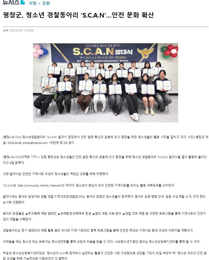 3. 보도내용 : 강원 평창군은 청소년들의 안전 문화 확산과 공동체 의식 함양을 위해 청소년 경찰동아리 'S.C.A.N' 발대식을 열고 활동에 들어갔다고 6일 밝혔다. 이번 발대식은 안전한 지역사회 조성과 청소년들의 책임감 강화를 위해 마련됐다. (중략) 'S.C.A.N'은 'Safe Community Activity Network'의 약자다. 청소년이 중심이 되어 안전한 지역사회를 만드는 활동 네트워크를 의미한다.