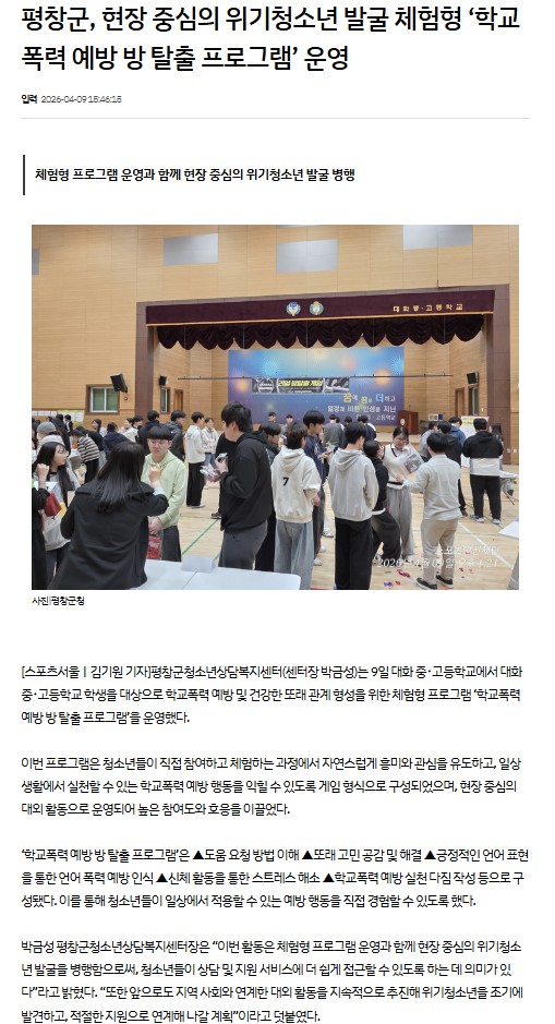 3. 보도내용 : 평창군청소년상담복지센터(센터장 박금성)는 9일 대화 중・고등학교에서 대화 중・고등학교 학생을 대상으로 학교폭력 예방 및 건강한 또래 관계 형성을 위한 체험형 프로그램 ‘학교폭력 예방 방 탈출 프로그램’을 운영했다. (중략) 박금성 평창군청소년상담복지센터장은 “이번 활동은 체험형 프로그램 운영과 함께 현장 중심의 위기청소년 발굴을 병행함으로써, 청소년들이 상담 및 지원 서비스에 더 쉽게 접근할 수 있도록 하는 데 의미가 있다”라고 밝혔다. “또한 앞으로도 지역 사회와 연계한 대외 활동을 지속적으로 추진해 위기청소년을 조기에 발견하고, 적절한 지원으로 연계해 나갈 계획”이라고 덧붙였다.