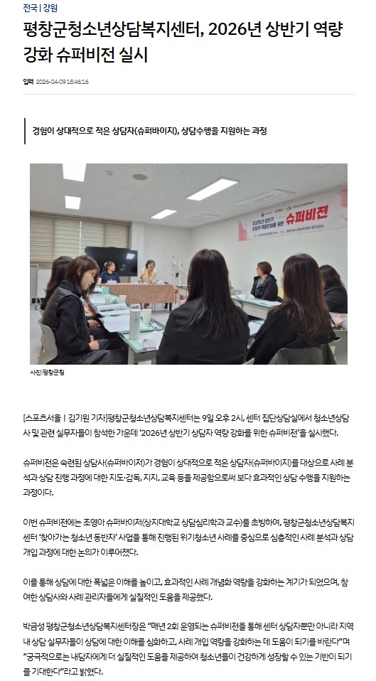 3. 보도내요 : 평창군청소년상담복지센터는 9일 오후 2시, 센터 집단상담실에서 청소년상담사 및 관련 실무자들이 참석한 가운데 ‘2026년 상반기 상담자 역량 강화를 위한 슈퍼비전’을 실시했다.