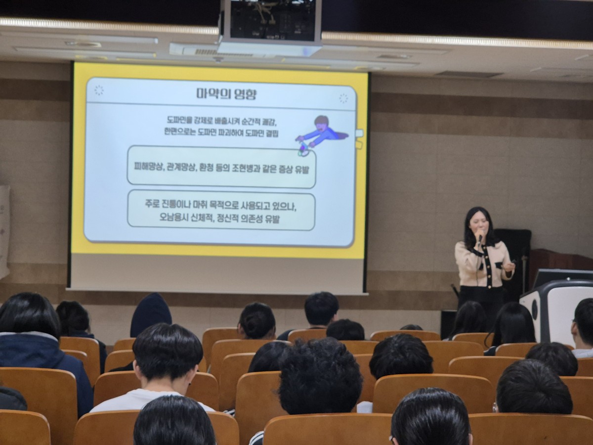 이어 진행된 마약중독 예방 교육에서는 △마약 및 유해 약물의 종류 △청소년기 약물 사용이 신체·정서에 미치는 영향 △또래 압력 상황에서의 대처 방법 △도움이 필요할 때 지원받을 수 있는 기관 안내 등을 다루며, 청소년들의 건강한 선택을 돕는 데 중점을 두었다.